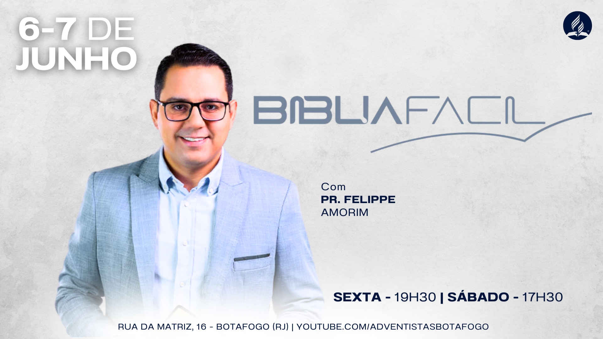 A Igreja Adventista de Botafogo vai receber um programa especial nos dias 6 e 7 de junho — sexta e sábado. Será uma edição do programa Bíblia Fácil, da TV Novo Tempo, com o Pr. Felippe Amorim.